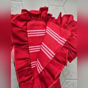 Rectangular Reversible table runner Pink-and-green rose print on red backdrop • Ruffled edges • Made of 100% cotton • Machine washable • 72in Lx 14in W