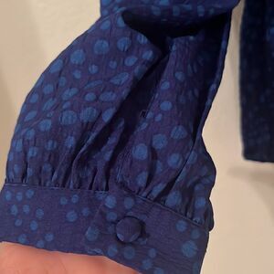This blouse is perfect for business casual setting. It is a beautiful, two-tone blue color. There is an eleastic band around the waist to add a little bit of flare. Long sleeve with one single button at wrist.