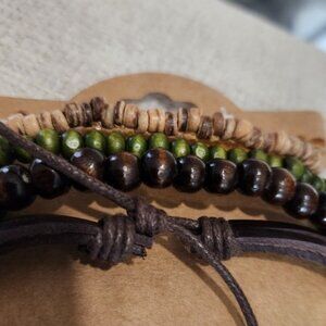 Nwt Womens /Mens Leather and Wood Brown Hues Bracelet Set