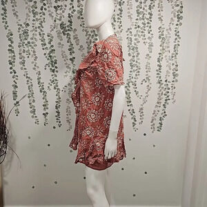 Color: Marsala; mauve; Pink color tone with white eyelet embroidery Short dress with round neck and short sleeves. Interior lining. Contrasting openwork embroidery detail. Back opening and button closure.