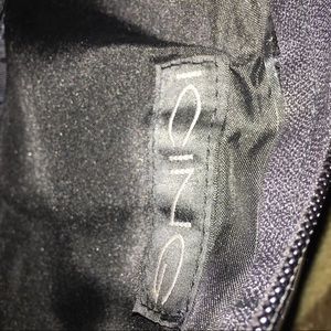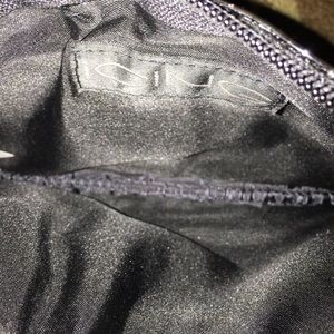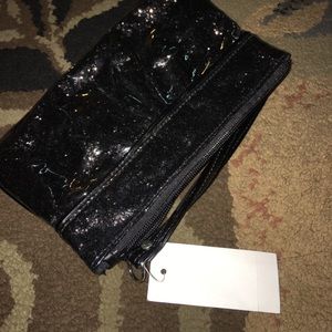 New with tags Icing wristlet in black/gray glitter on outside and black interior. Wristlet strap. Top zipper. Approx size is 9" wide on the bottom widest part. Stands about 5.5". Strap is about 14" start to end. Peeling on the she’s as shown.
