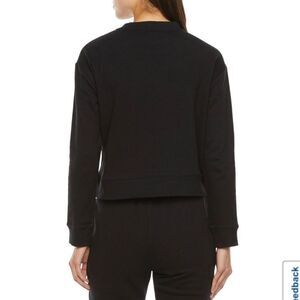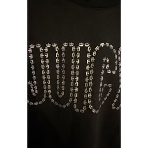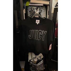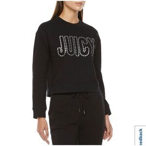Juicy By Juicy Couture French Terry Womens Crew Neck Long Sleeve Sweatshirt size small - slight cropped color/licorice black & silver bling/ metallic spells juicy across the front in mini queen crown signature logo