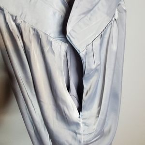 New with tags nasty gal oh what a night satin halter jumpsuit in a pale blue silver with oversized wide leg bottom button halter neck us size 6