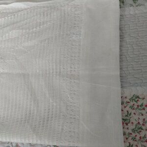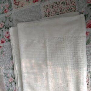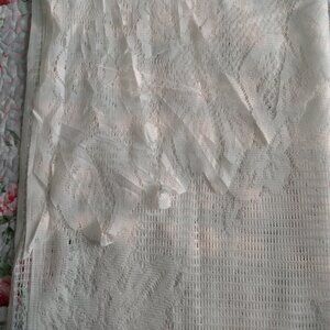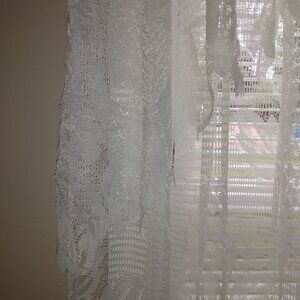 Lace curtains with attached valances, ivory lace, 2panels with attached valances, new in original packaging, very beautiful! 58wide x 84long each panel so a total of, 116 wide x 84 long