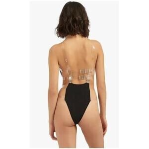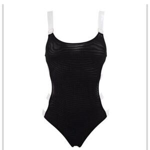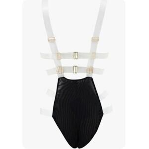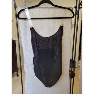Product Details: New womens sz Medium black Bluebella Tao clear strap opaque mesh bodysuit. Approx 14" pit to pit.