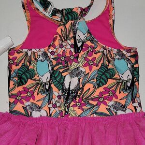 This is the most adorable swimsuit. Is such bright colors. Has the 3 snaps at the crotch area. Tutu type layers. No damage.