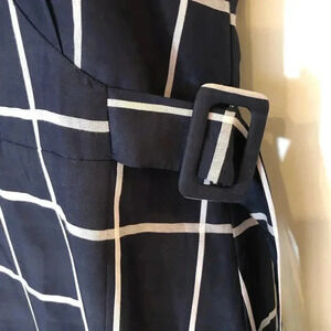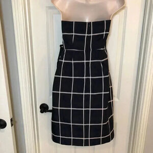 New with tags purchased from Nordstrom J.O.A strapless navy blue and white squares geometric strapless, zipper back faux wrap dress with adorable belt size Medium. Please see the measurements in the pictures.