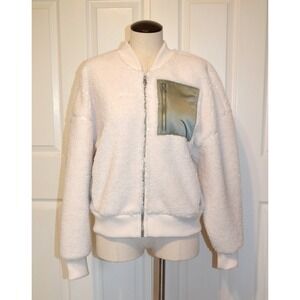 Women's Abercrombie & Fitch White Sherpa Jacket, size large, green satin accent trim on the pockets and zippered chest pocket, crew trim at the waist, collar and sleeve ends.