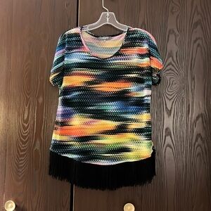Ny collection multi-colored top with short sleeves and trimmed at the bottom with black fringe. Size SP.