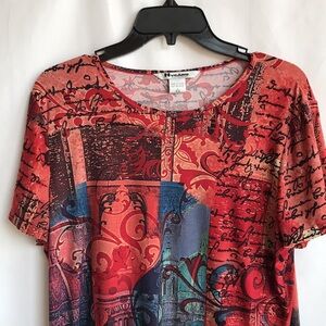 Nycard Collection soft to the touch rust/black/blue/green print easy-wear tee, size L. Round neckline. Stretchy fabric. Pullover styling. Good preowned condition. Put on a pair of black pants or a skirt and go. Or create your own unique outfit.