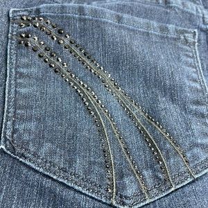 Description: NYDJ Not Your Daughter's Jeans Dark wash bootcut mid rise size 6. Beautiful black beaded stud back pockets