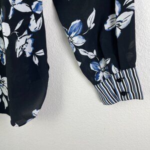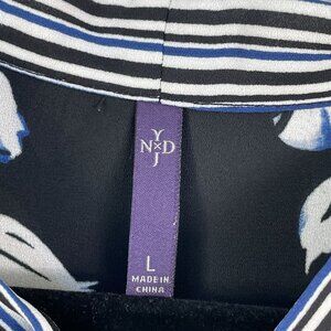 Nydj Womens Large Blue White Black Floral Tie Neck Blouse Long Sleeve Shirt Top