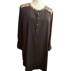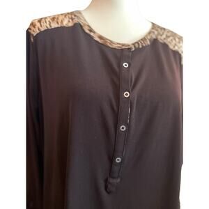 Nygard Animal Print Tunic, Plus Size 1X. Make a statement in this fierce animal print top. Designed for both comfort and flair, this longline blouse has roll tab sleeves, a partial button front and a flattering relaxed fit. The back and shoulder panels showcase an allover leopard style print, adding a bold, stylish touch perfect for pairing with leggings or skinny jeans. Stretchy comfortable fabric - 94% polyester, 6% elastane. Excellent condition.