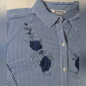 Nygard Blue & White Striped Button-Up Shirt Embroidered Floral Accents Size 3X