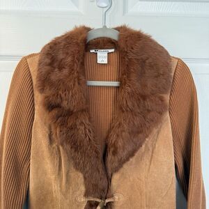 Nygard Brown Suede Leather Sweater Jacket Rabbit Fur Collar Women’s Size S (6-8)