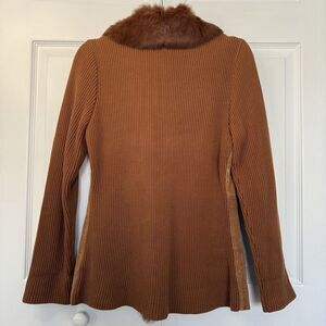 Peter Nygard Collection brown suede leather sweater jacket. Gorgeous suede leather front with sweater knit sleeves and back. Dyed rabbit fur collar and barrel button closure. Gives groovy retro vibes. Womens size small (6-8). In excellent pre-owned condition.