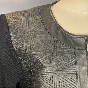 Geometric embossed leather with front zipper and zipper pockets. Back and sleeves are a stretch knit with leather accent shoulders. Lovely condition. Approx measurements pit to pit 21, length 26.5 and sleeves 25 inches.