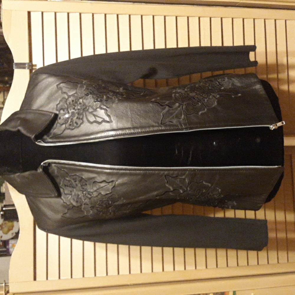 Nygard Collection leather jacket with sweater material on the back and sleeves. front and collar of the jacket is 100% leather 22" sleeves. 17.5" armpit to armpit laying flat.