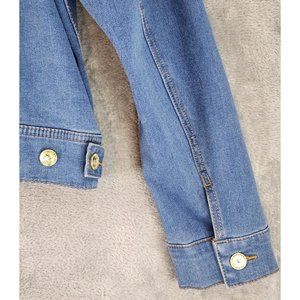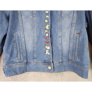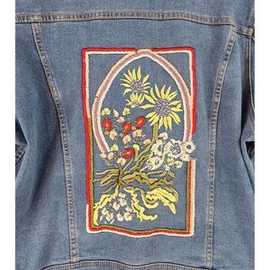 Cool & comfortable women's blue denim, floral embroidered, button up jacket.