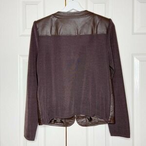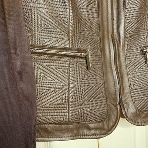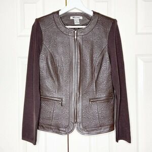 Great leather combo jacket by Nygard. Two zip pockets. Zips up front. Two different materials. Sleeve and back are a stretchy knit. Leather is topstitched. Very classy! All measurements are approximate, taken flat and closed.