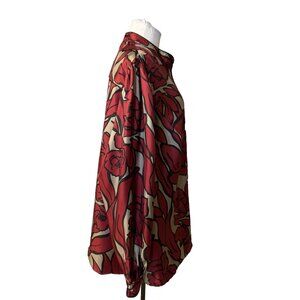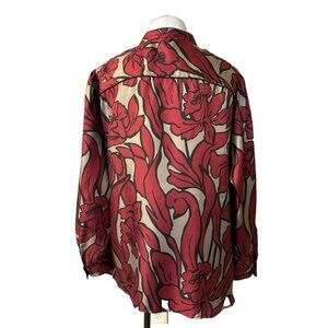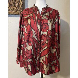 This pretty top is from Nygard Collection in a women's size 20. Has fabric covered buttons down the front. Sleeve cuffs have a single button. Red, black and light brown in color. Has black piping around the edges.
