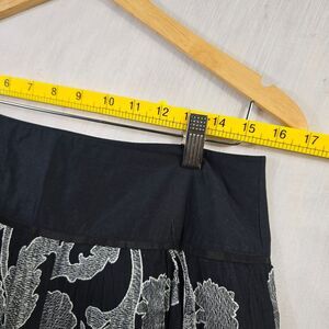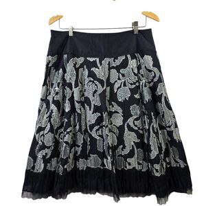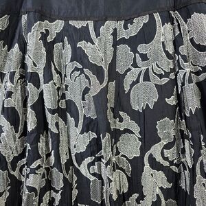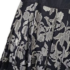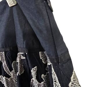Make a statement in this embroidered A-line skirt from Nygard Collection. With intricate white and gray floral detailing on a rich black base, it blends elegance with edge. The pleated hem adds movement, while the solid waistband keeps it sleek and structured.