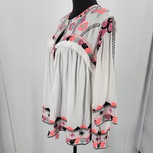 Nylon Apparel Embroidered Floral Open Front Swing Top Size Small. One Hook and Eye and Tassel Closure. See Photos for Approximate Measurements.