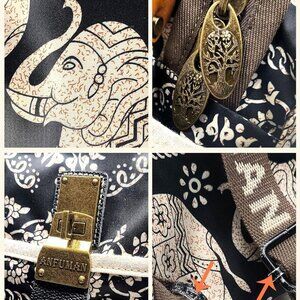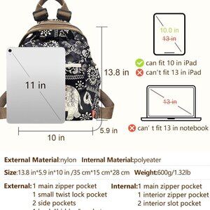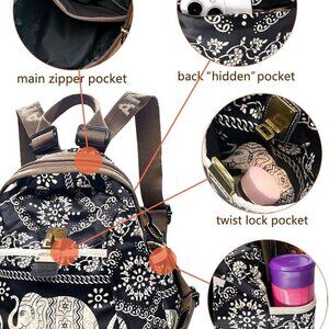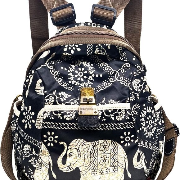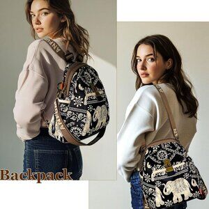 Features: Adorable nylon backpack featuring a fun elephant print, lightweight and soft for everyday use. Equipped with 5 exterior pockets — a large zippered front, twist switch pocket, two side pockets perfect for water bottles or umbrellas, and a discreet back pocket. Inside, you'll find 2 zippered compartments and a spacious section for all your essentials. Exquisite vintage bronze zippers add a chic touch.
