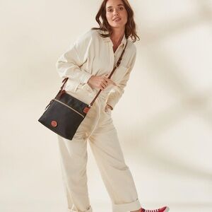 One outside zip pocket. One inside zip pocket. Two inside slip pockets. Cell phone pocket. Inside key hook. Adjustable strap. Strap drop length 25". Lined. Zipper closure.