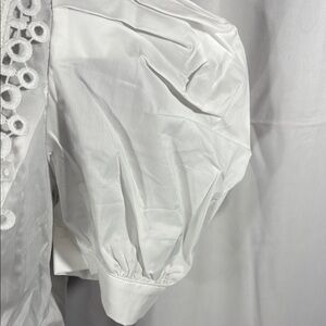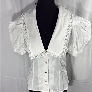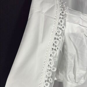 This elegant white blouse features stylish puff sleeves and delicate lace detailing, perfect for any occasion. Its classic design offers a sophisticated look. NWT