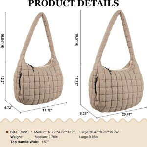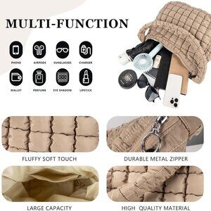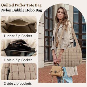 Features: This large-capacity tote measures about 17.7" x 12.2" x 4.7" — perfect for carrying your cosmetics, phone, tablet, books, or even a small laptop. The quilted nylon design is lightweight yet durable, with a soft, fluffy feel that adds a touch of chic. It features a classic quilted top handle and a detachable crossbody strap for versatile wear. Comes with multiple zipped compartments inside and out, keeping your essentials safe and organized.