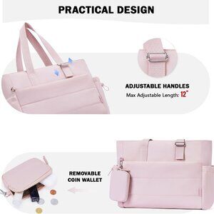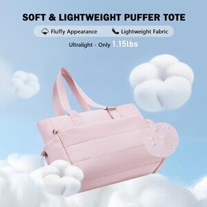 Features: Made of durable, water-resistant nylon with a soft, fluffy feel thanks to unique quilting and cotton filling. Weighs just 1.15 pounds, so it's easy to carry all day. Adjustable top handle for a perfect fit, plus a luggage trolley strap that slides over your suitcase handle—perfect for travel. The spacious interior includes a padded compartment for a 15.6-inch laptop, plus multiple pockets for your phone, passport, keys, and small essentials. Comes with a detachable coin wallet you can attach or keep inside.
