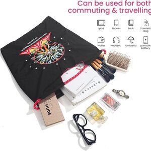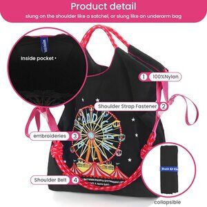 Features: This large capacity tote measures about 24 x 6 x 18 inches, making it super practical for work, travel, or casual outings. It has adjustable shoulder straps, a main interior pocket with a handy inner pouch for your wallet, makeup, or small papers, plus a separate small pocket ideal for your phone, keys, or cards. The embroidery of a Ferris wheel adds a charming touch to its sleek black look.