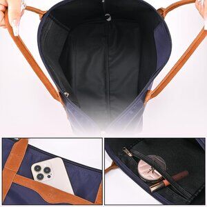 Features: This roomy nylon tote has a sleek design with genuine leather handles for comfy shoulder wear. The secure zipper closure keeps your essentials safe, plus it offers multiple pockets—front magnet, interior slip, and mesh zipper—perfect for organizing everything from laptops to makeup.