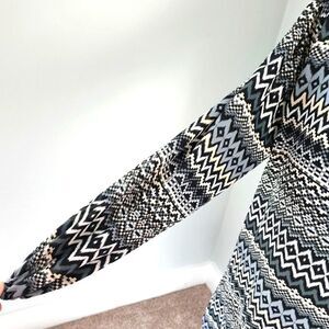 Nymphe women's shift dress. Size small. Round neck. Elastic hem at sleeve. Pullover. Lined. Gray, black, blue Aztec print. 100% polyester. Lining 95% polyester and 5% spandex. Like new. No tears or stains.