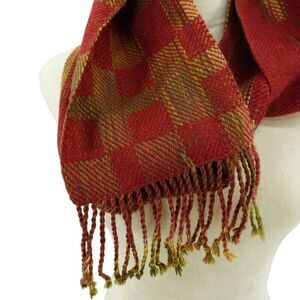 Add warmth and style to your wardrobe with this Nynke New Zealand plaid knit scarf. Crafted in red and gold, it features a soft knit texture and fringe details, ideal for versatile styling.