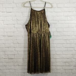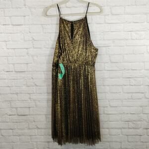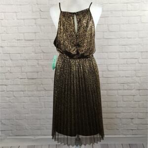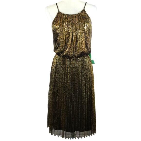 O Candalite Petite Women's Gold Black Pleated Sleeveless Midi Knee Dress NWT PXL