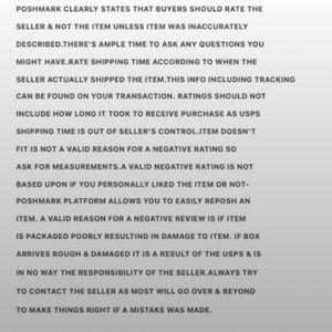 -I PLACE MUCH IMPORTANCE ON BUYERS WHO HAVE PREVIOUSLY PURCHASED FROM ANY BUYER ON POSHMARK AND FOLLOWED PROPER PROTOCOL-ACCEPTED PURCHASE IN A TIMELY MANNER, LEFT A STAR RATING & A LEFT AN OPTIONAL KIND COMMENT.REVIEW MY NUMEROUS FEEDBACK RECEIVED FROM MY VALUED CUSTOMERS
