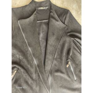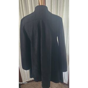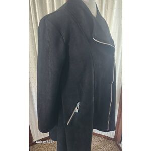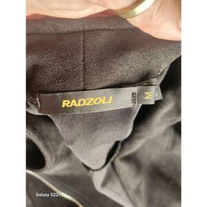 The Radzoli faux suede slanted zip poncho is a unique and stylish outerwear piece designed for women. Made from luxurious polyester faux suede, this black poncho features a slanted zip closure and an asymmetric sharkbite hem, adding a modern and trendy touch. The size is medium. The poncho style offers a versatile option for various casual or dressy occasions. Perfect for those looking for a fashionable and high-quality addition to their wardrobe.