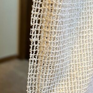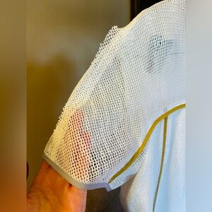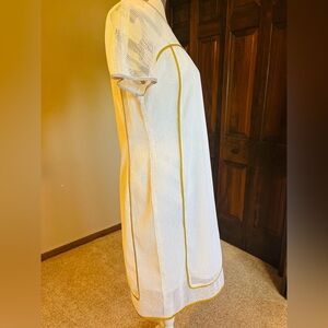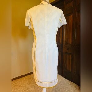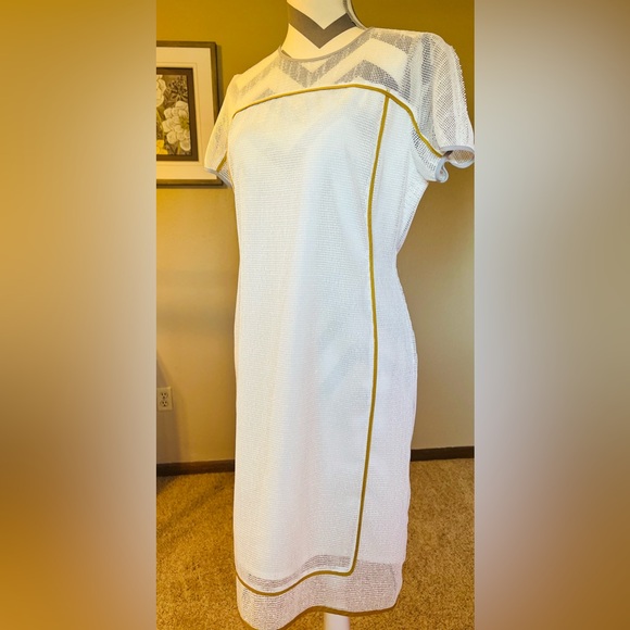 Elegant with a cool texture. Size 8, short sleeved, lined mesh cocktail dress. White w gold trim. 38” neck to bottom hem. 16” pit to pit.