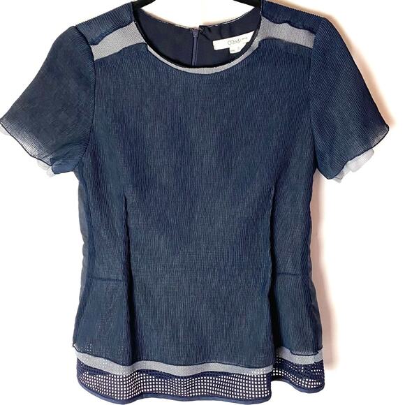 Excellent used condition! Beautiful short sleeved blouse with light layers of different textures. Navy blue and gray. Puckered and gathered waist. Back zip closure. Chiffon overlay. Fully lined.