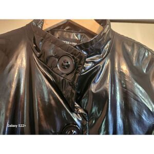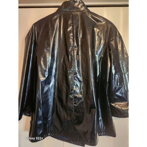 The Focus 2000 polyurethane shiny black rain jacket is a stylish and functional outerwear option for women. This mid-length jacket features a button-up closure, and a vibrant blue lining that adds a pop of color. The black shiny exterior gives it a fashionable edge, perfect for rainy days in the fall and spring seasons. The regular size 10 fit ensures a comfortable and flattering silhouette for any woman looking to stay dry in style. Excellent condition.