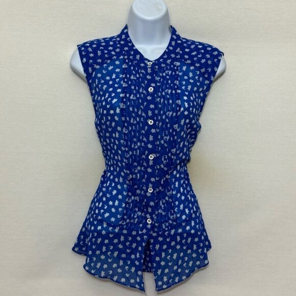 O-59 CAbi Blue White & Black Floral Pleated Front Sleeveless Button Down Blouse