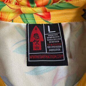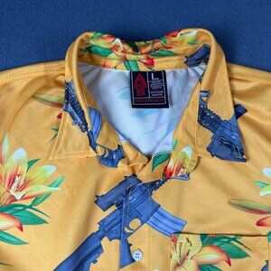OAF Nation Men's L Yellow Hawaiian Floral Tropical Tactical Gun Button Up Shirt. 100% Polyester. There are a couple of spots, see photos. Hardly noticeable.