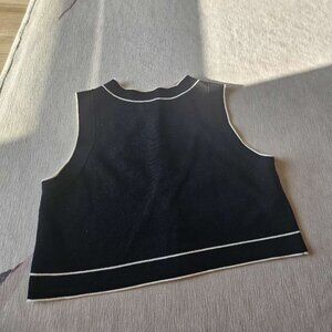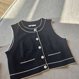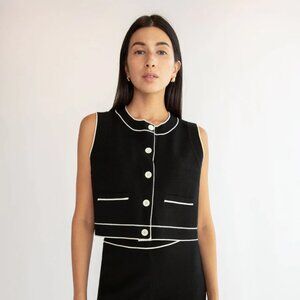 This button up sweater vest is inspired by Parisian styles and is designed with contrast buttons and piping along the trims. It's made in a cropped length to wear with high-rise bottoms from mini skirts to trousers.