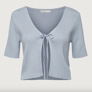 This ribbed short sleeve cardigan is made in a slim fit and cropped length. It's designed with an open front with ties for added detail.