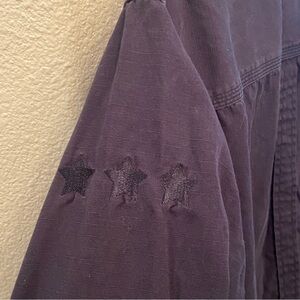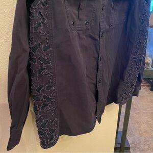 Pre-owned in great condition with no rips or stains. Men’s black buttoned long sleeve shirt with graphic and distressed detailing on the sides. Left shoulder has stars embroidery. Great with jeans. Comes from smoke and pet free home.