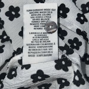 Washable polyester with a crinkle feel, a white and black daisy print button up blouse with a pointed fold over collar and a patch pocket on each chest. High lo hem with a curved back hem. Thicker sleeve cuff detail. Excellent condition. Size small, measures 24” from armpit to armpit 24” from top of front shoulder to bottom ham and 30” from shoulder to bottom hem.