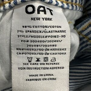 OAT NY size 8/29 pinstripe jeans. Blue and white, with yellow stitching. Features cuffs that can be rolled up for a versatile look. 98% cotton, 2% spandex. Super cute for spring!