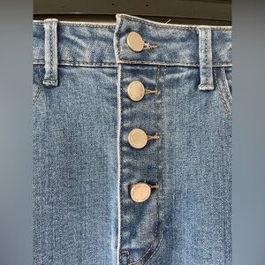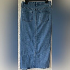 OAT New York Light Wash Denim Maxi Skirt Size 6/28 Slit Front Pockets Button Fly
